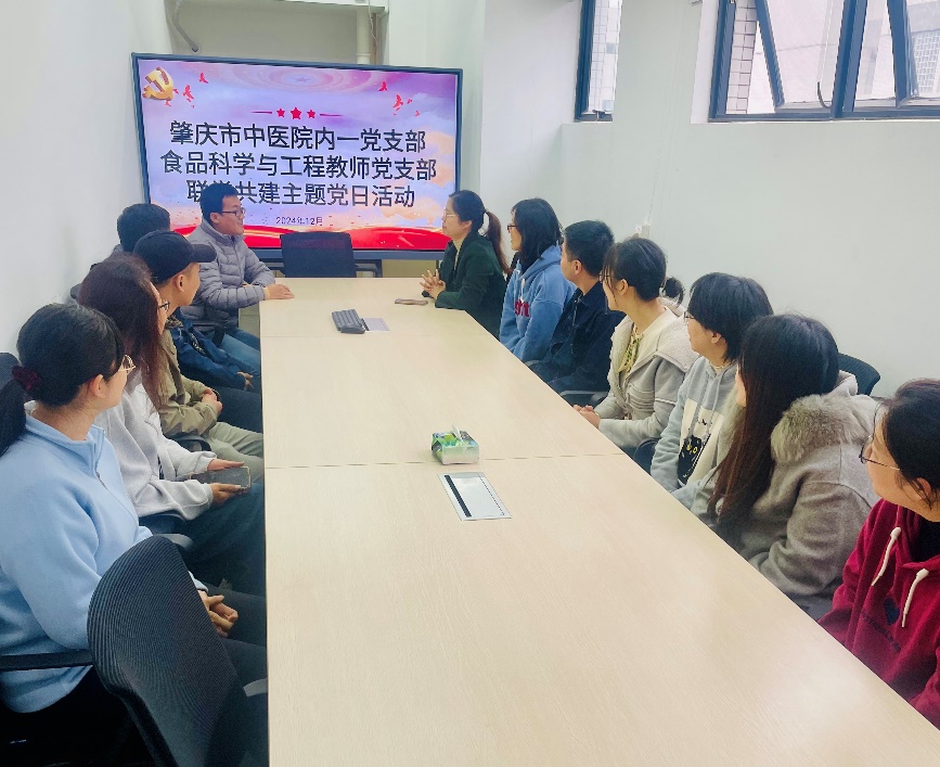 在新时代党的建设总要求下,探索联学共建的新模式,12月25日,食品科学与工程系教师党支部邀请肇庆市中医院内一党支部来公司开展中医主题讲座与座谈调研活动。肇庆市中医院医教部谢君副主任,肇庆市中医院内一党支部书记、脾胃科谢新坤主任参加了活动。