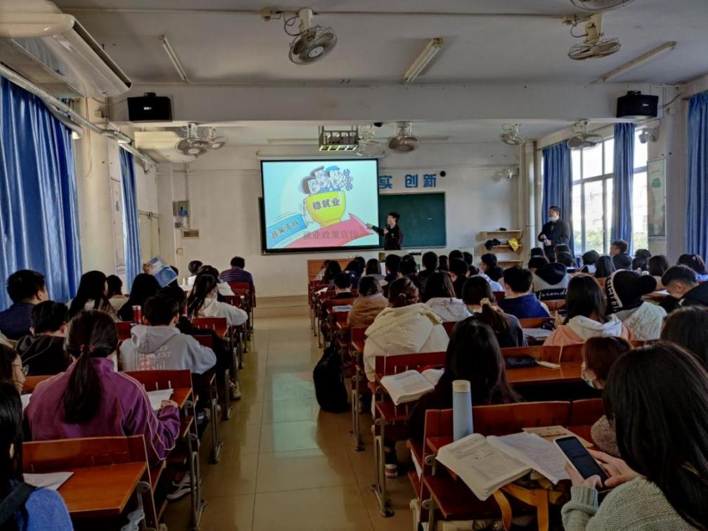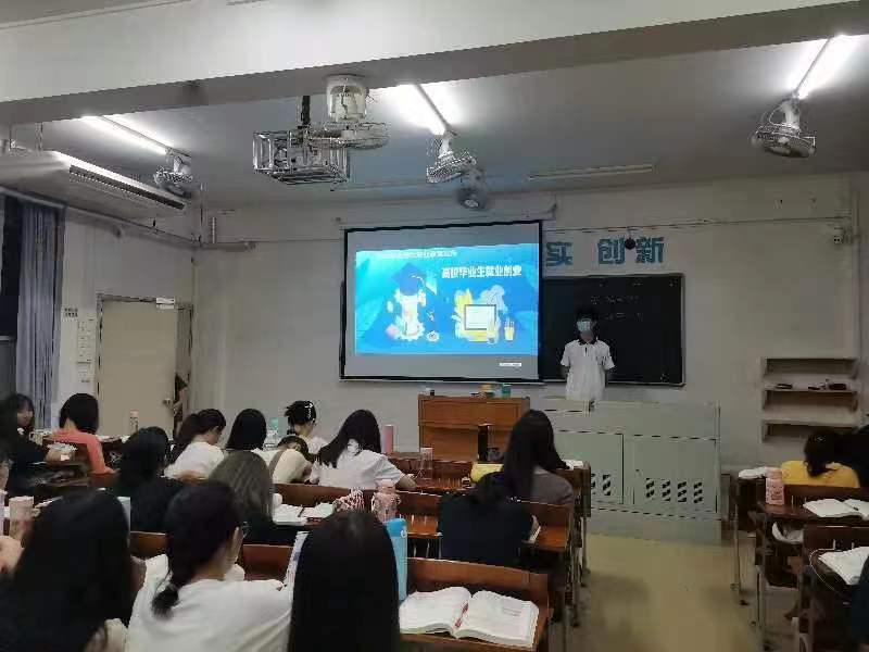 23届制药工程班同学则从就业形势、就业创业政策、就业信息服务及就业流程四方面分析了2022年毕业生的就业形势与政策,建议班内同学们通过校园招聘会、专业网站等渠道获取就业信息。