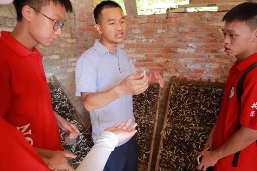 突击队前往肇庆市德庆县回龙镇开展实践活动,食药学子在指导老师的带领下发挥专业所长,将课堂学习和生产实践紧密结合,深入开展社会实践调研,通过问卷调查、与当地蚕桑企业负责人面对面交流、实地参观桑叶茶加工厂、养蚕基地等方式,在田间地头、生产车间深入了解“种桑养蚕”生产现状。