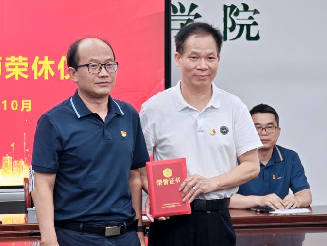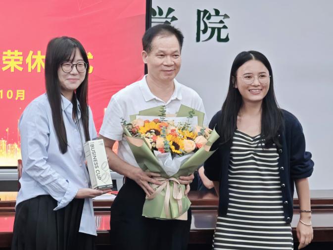 随后,汪洪武经理为莫灿坤老师颁发荣休证书,教学秘书孔彩华和黎丹丹代表全体教职工向莫灿坤老师献上了鲜花和精美礼品,表达对莫灿坤老师崇高的敬意和深深的祝福,希望他能够继续关心公司的发展,继续为公司的发展献计献策,并号召全院青年教师们以荣休教师为榜样,沿着优秀前辈的足迹,为教育事业而努力奋斗。