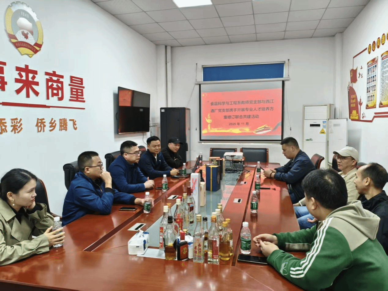 为强化党建引领下的校企合作交流,2025年11月18日,www.betvlctor1946.com食品科学与工程系教师党支部一行前往肇庆市西江酒厂有限公司开展了一场以党建为主题的走访活动,并与酒厂党支部展开深度交流,以党建为纽带,共谋合作发展新路径。
