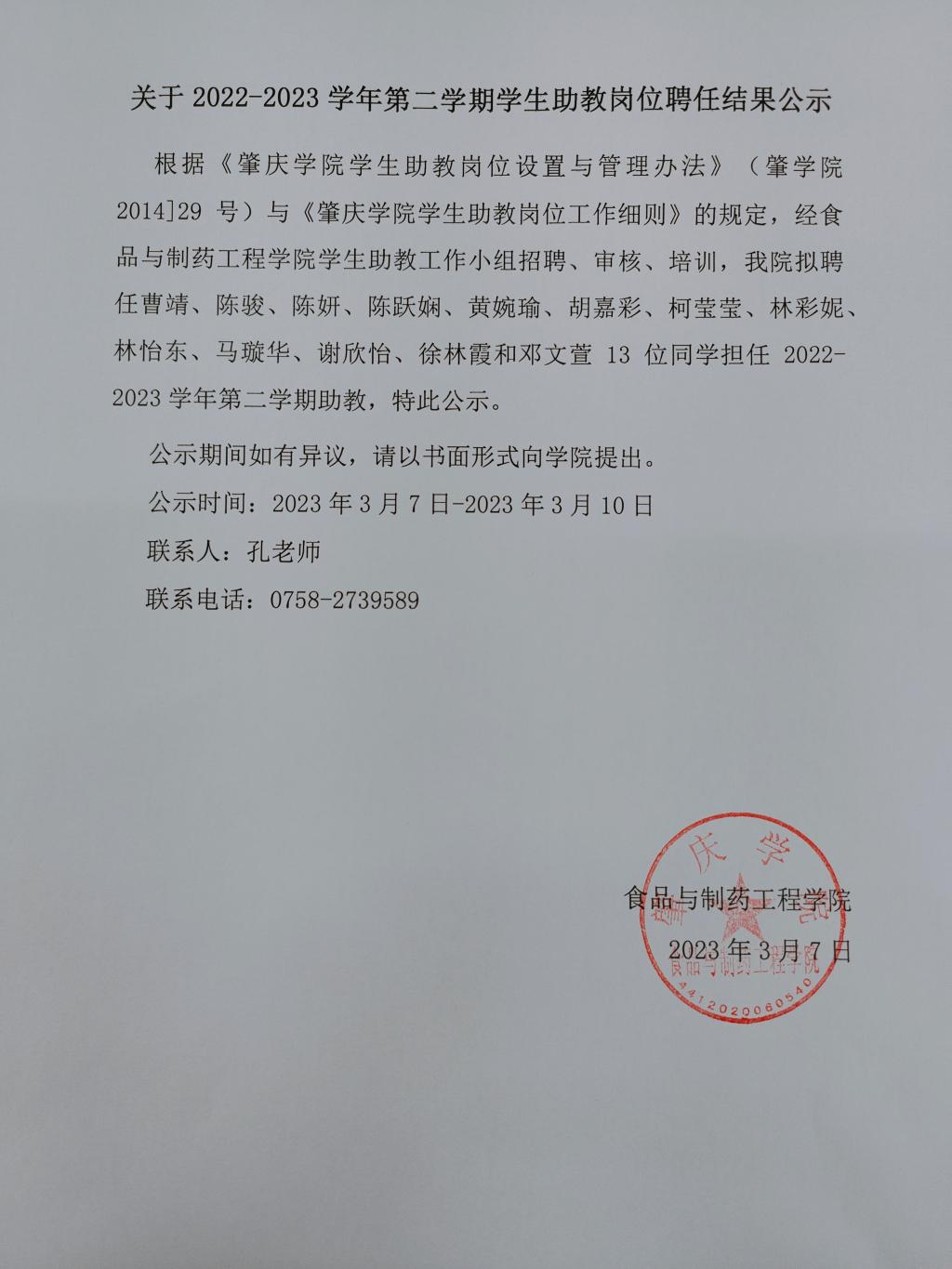 2022-2023学年第二学期员工助教岗位聘任结果公示