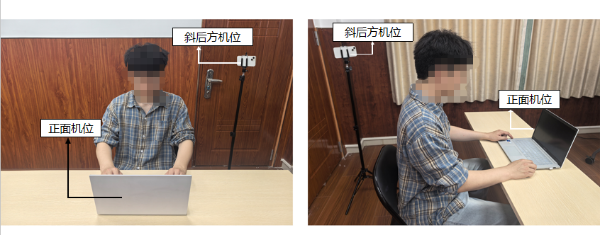 3.复试前按要求安装调试好设备。需要准备“双机位”硬件,笔记本电脑(或平板)和智能手机各一部。笔记本电脑(第一机位)从正面拍摄,放置在距离本人30cm处,另一台设备(第二机位)从考生侧后方45°角度拍摄,确保第一机位和第二机位分别从考生正前方和身后完整拍摄到考生,面试组能够从第二机位清晰看到第一机位屏幕。效果图如下,考生可根据自身情况调整。